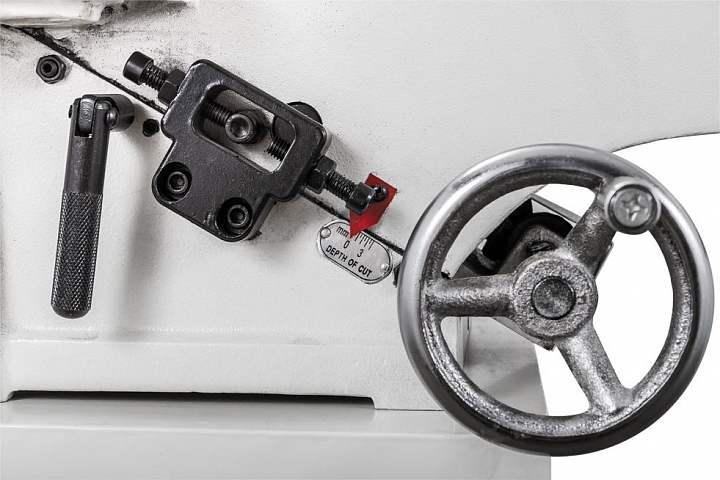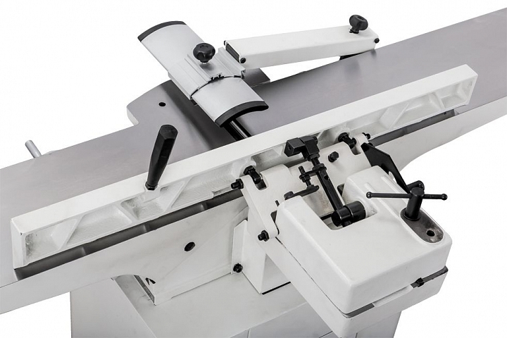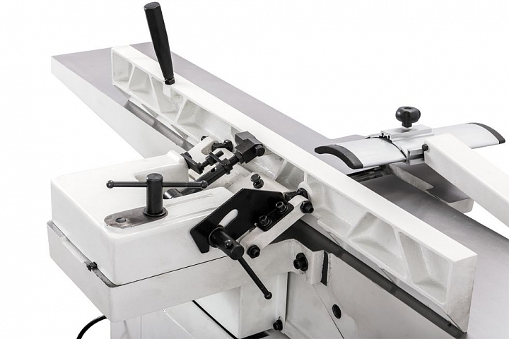 Оба стола регулируются по высоте при помощи винтовых механизмов, приводимых в действие ручками-маховиками. Перемещением подающего (переднего) стола устанавливают глубину строгания, для чего есть соответствующая разметка; принимающий (задний) регулируют только во время обслуживания станка при наладочных операциях. Упор заготовки чугунный, с механизмом наклона (он возможен в обе стороны). Фиксация выбранного положения производится резьбовым зажимом. Ножевой вал укомплектован тремя ножами, допускающими повторную заточку. Их типоразмер и ассортимент такой же, как и у профессиональных фуганков Jet с аналогичной шириной строгания.